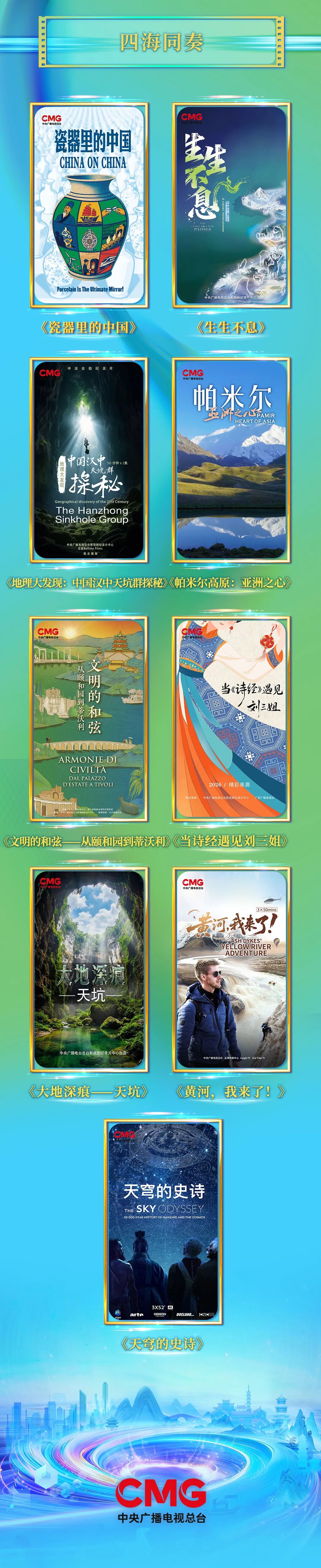 “四海同奏”板块发布9部中外合拍纪录片,在多元文明对话中推进中华文化海外传播。《瓷器里的中国》以瓷器为载体,展现璀璨中华文明画卷;通过国际镜头语言和全民征集影像,《生生不息》全景展现中国生物多样性,讲述动植物与自然环境间的奇妙故事。《地理大发现:中国汉中天坑群探秘》《帕米尔高原:亚洲之心》《天穹的史诗》《文明的和弦——从颐和园到蒂沃利》《当诗经遇见刘三姐》《大地深痕——天坑》《黄河,我来了!》等作品以国际视角纵览奇观,诠释自然与文化遗产的无穷魅力。